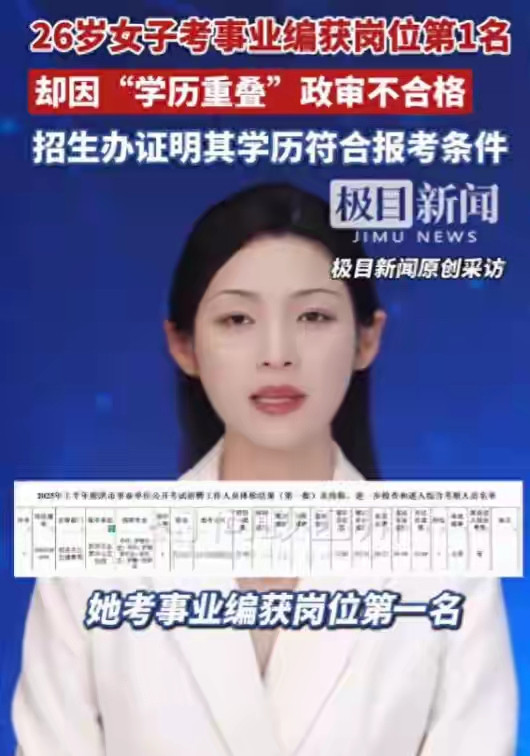 2025年年底,四川射洪一桩考编争议让全网炸了锅。26岁的税女士拼尽全力拿下医疗岗事业编笔试、面试双第一,眼看就要上岸,却在最后审核环节被泼了冷水——认定“不合格”,理由是8年前的“学历套读”。这事儿不仅让税女士懵圈,更让无数考编人揪紧了心:千军万马闯过独木桥,咋就栽在多年前的学历上了?