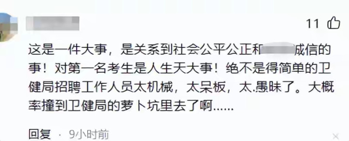 这事发酵后,网友吵翻了天。支持税女士的人觉得太冤:“备考数年拿第一,就因为8年前的学历被卡,太可惜了!”“当年教育部门都认可的学历,现在卫健局凭啥推翻?”还有人质疑程序不公:“要是早说学历套读不行,报名时就该卡住,现在考完了才说,不是浪费大家时间吗?”也有网友觉得合规审查该严格:“学历套读本就是考编红线,严格把关没毛病,但得有统一标准。”。