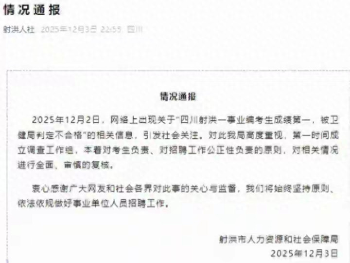 好在官方很快有了回应。12月3日,射洪市人社局发布通报,说已经成立调查工作组,会全面、审慎复核这件事,保证结果公正合规。其实这事儿的核心争议很简单:当年合规拿到的学历,现在考编到底认不认?不同部门的政策解读能不能前后一致?