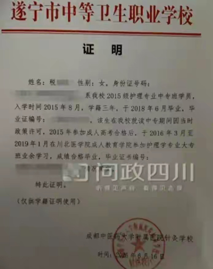更让人费解的是,两个官方部门的说法直接“打架”。卫健局给出的依据是《四川省2015年成人高校招生工作的通知》,里面明确成人高考报名者得是“非高、中等学校在校生”,税女士当时是中专在校生,所以不符合条件。可射洪市教育考试院和招生考试委员会办公室却盖了红章,出具证明说税女士当年完全符合成人高考报考条件,她的中专学校也证实,当时政策允许这种工学交替的学习方式。
