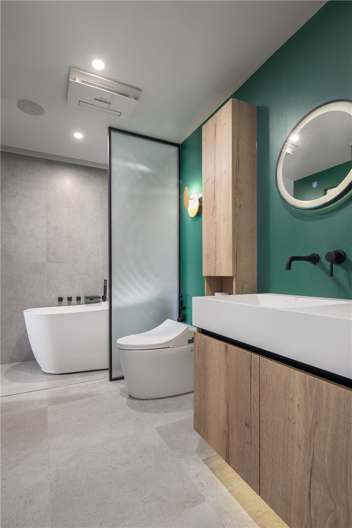卫生间,没有做防水,但是通风系统还是非常不错的,而且色彩上和灯饰上的搭配也显得非常的时尚舒适,不会觉得单调范围,特别是这种孔雀绿的搭配,清新又活力。