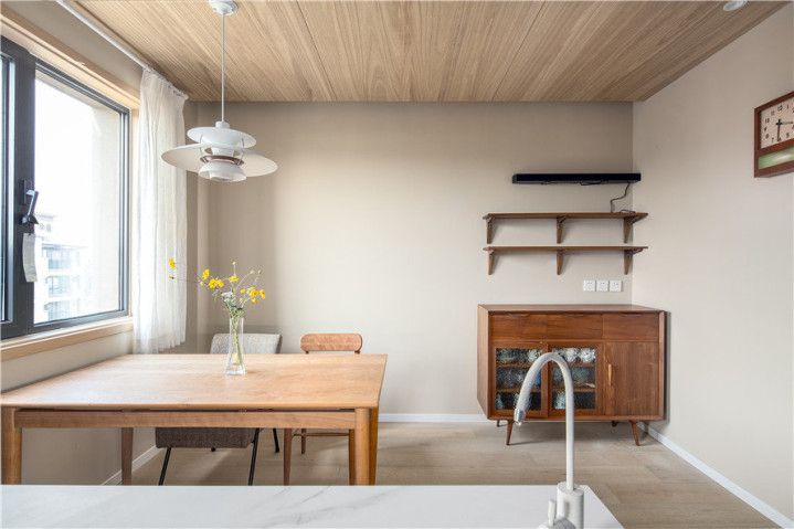 天花板的设计也是有区别的,比如厨房的天花板做了白色的背景色,而餐厅的天花板则是做了木板装饰,这样的差别也是为了更好地区分开这两个功能区。