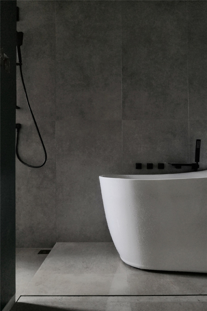 卫生间的背后就是卧室的衣帽间位置,做了透明的玻璃是为了增强室内的采光,这样卫生间内部的采光就充足了。而且整个灰色的背景不会显得压抑。