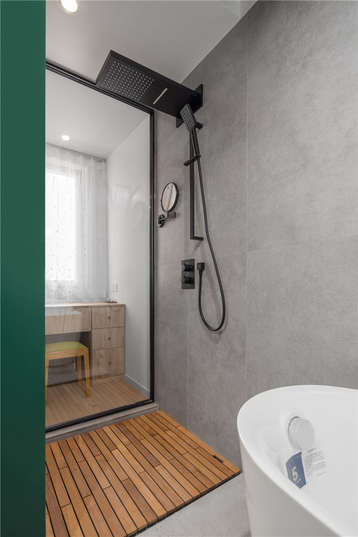 卫生间不仅有浴室,还有淋浴区,而淋浴区的地漏不得不夸,实木的设计感非常的温馨,再加上做了很好的漏水装置,这样看起来的卫生间更好看。