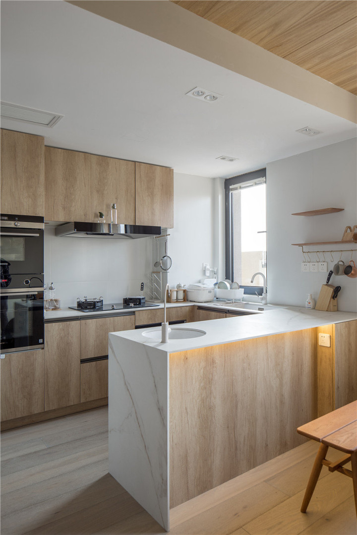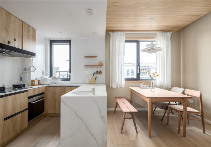 经过客厅后就可以看到餐厅和厨房,他们共用一个独立的大空间,采光非常好,而且厨房的装修设计非常的有特色,定制的橱柜以及大理石的厨房岛,实木色和大理石的色彩搭配起来非常的好看,温馨舒适,而且看起来整体感也很强,虽然厨房和餐厅之间的色彩并不一致,相似色彩的搭配之下更显得日式风格的温馨和舒适。