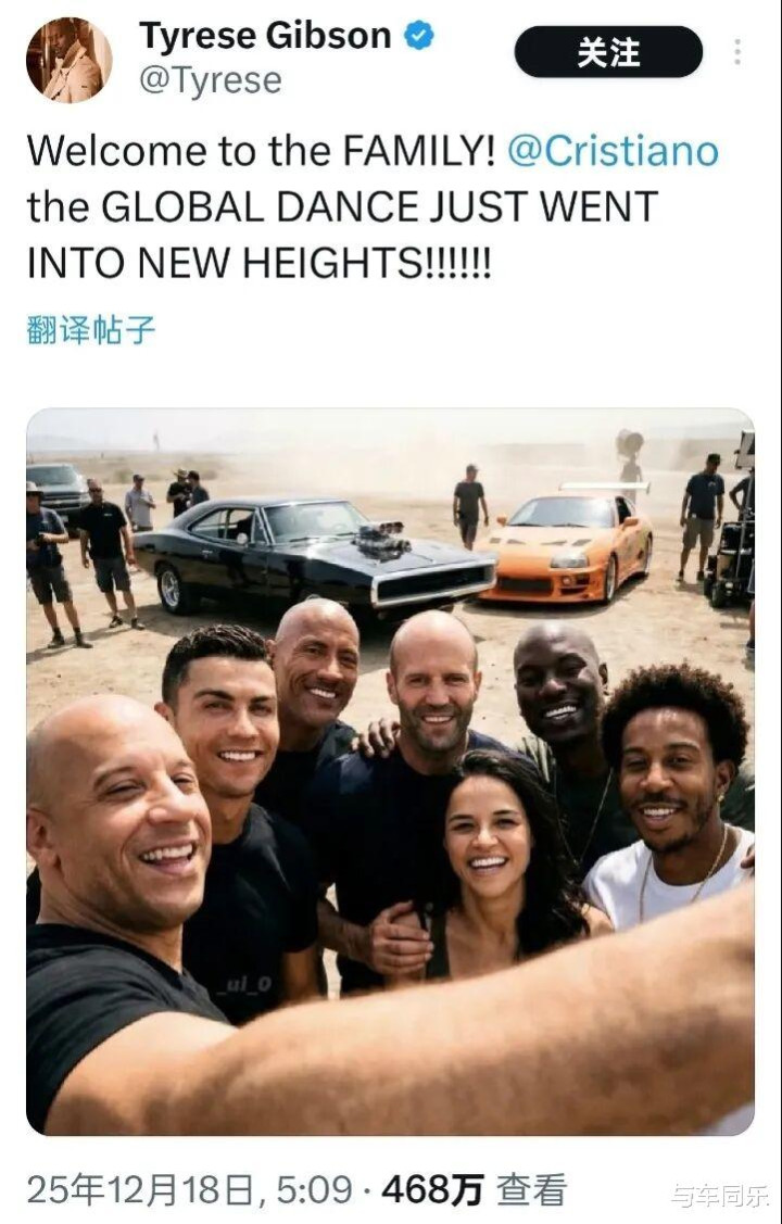 电影系列的主角范·迪塞尔在其社交网站上也晒出他与C罗的合照,并配文:很多人都来问,他是否会加入"速激"大家庭......我想说,这是真的,我们专门为他安排了一个角色。