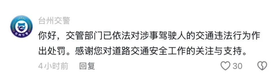潮新闻记者注意到,台州交警官方账号随后在该视频评论区回复:你好,交管部门已依法对涉事驾驶人的交通违法行为作出处罚。感谢您对道路交通安全工作的关注与支持。